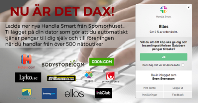 Stöd Skellefteå IBS automatisk - ladda ner det nya tillägget på din dator! Nu har äntligen Sponsorhuset släppt den nya versionen av Handla Smart. Tillägget för Google Chrome som gör att både du och Skellefteå IBS automatiskt får pengar tillbaka när du handlar från över 500 kända nätbutiker. Klicka på denna länk när du sitter vid datorn och testa hur smidigt det funkar: www.sponsorhuset.se/skellefteaibs/handlasmart