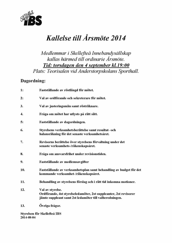 Medlemmar i Skellefteå Innebandysällskap kallas härmed till ordinarie Årsmöte. Tid: torsdagen den 4 september kl.19:00 Plats: Teorisalen vid Anderstorpskolans Sporthall. Skellefteå IBS 4 aug 2014 0kommentarer